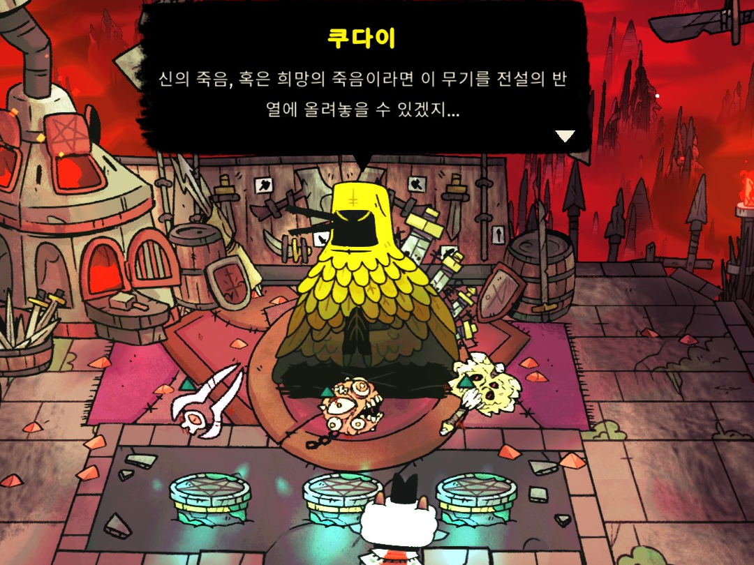 쿠다이는 전설의 무기가 '신의 죽음' 혹은 '희망의 죽음'을 통해 탄생한다고 말하죠. 팬덤 위키에서는 "마르코시아스가 신을 죽였기에 건틀릿이 전설이 된 것이 아닐까?"라고도 추측했지만 제 생각은 달라요.